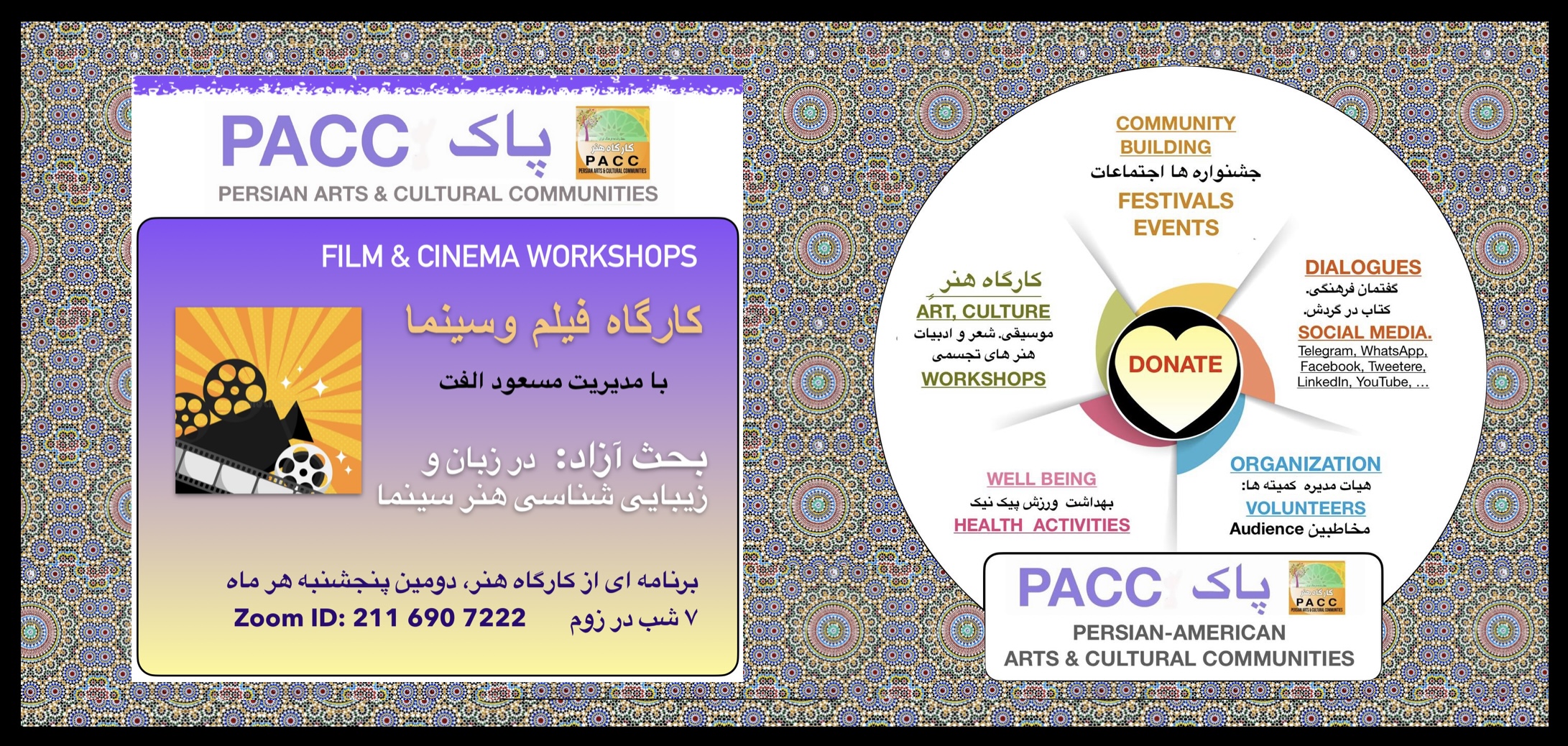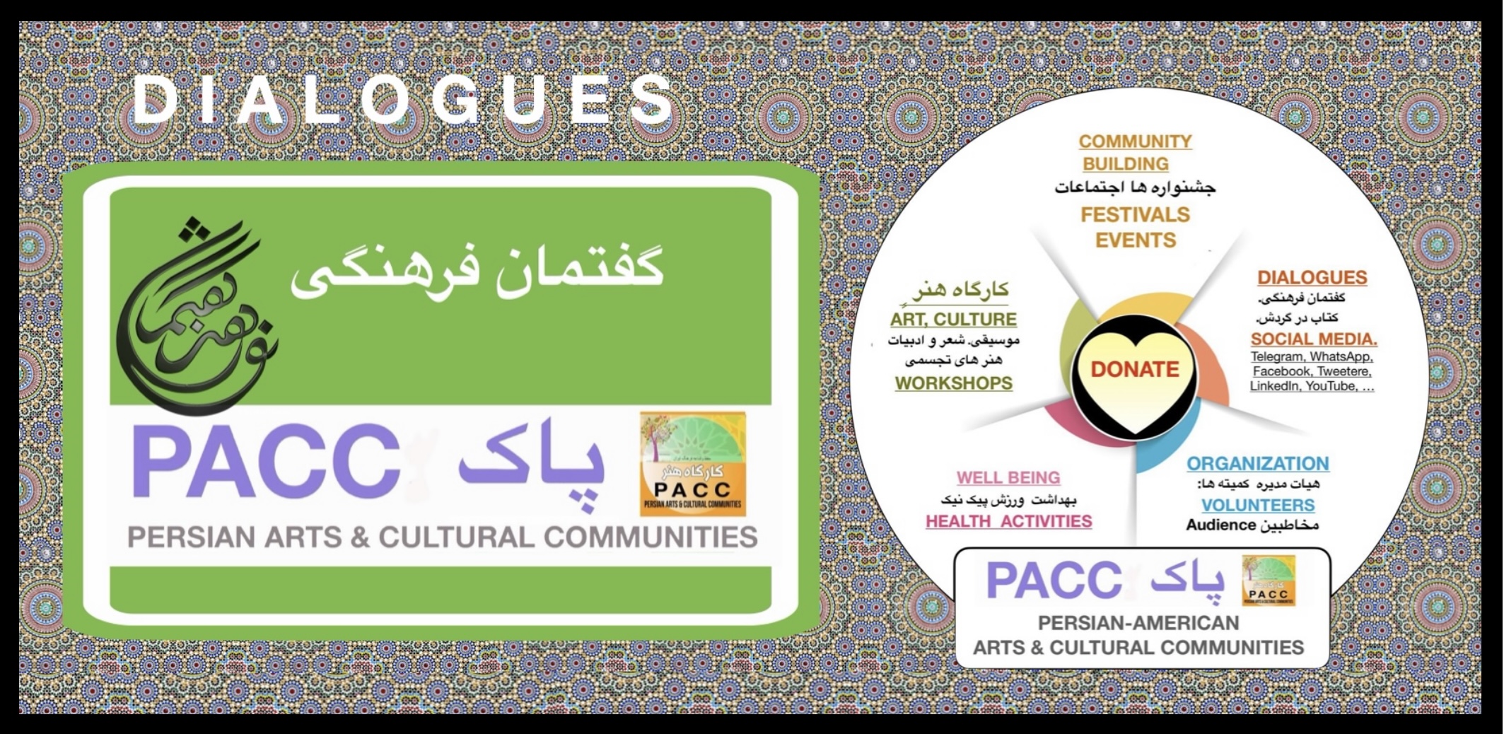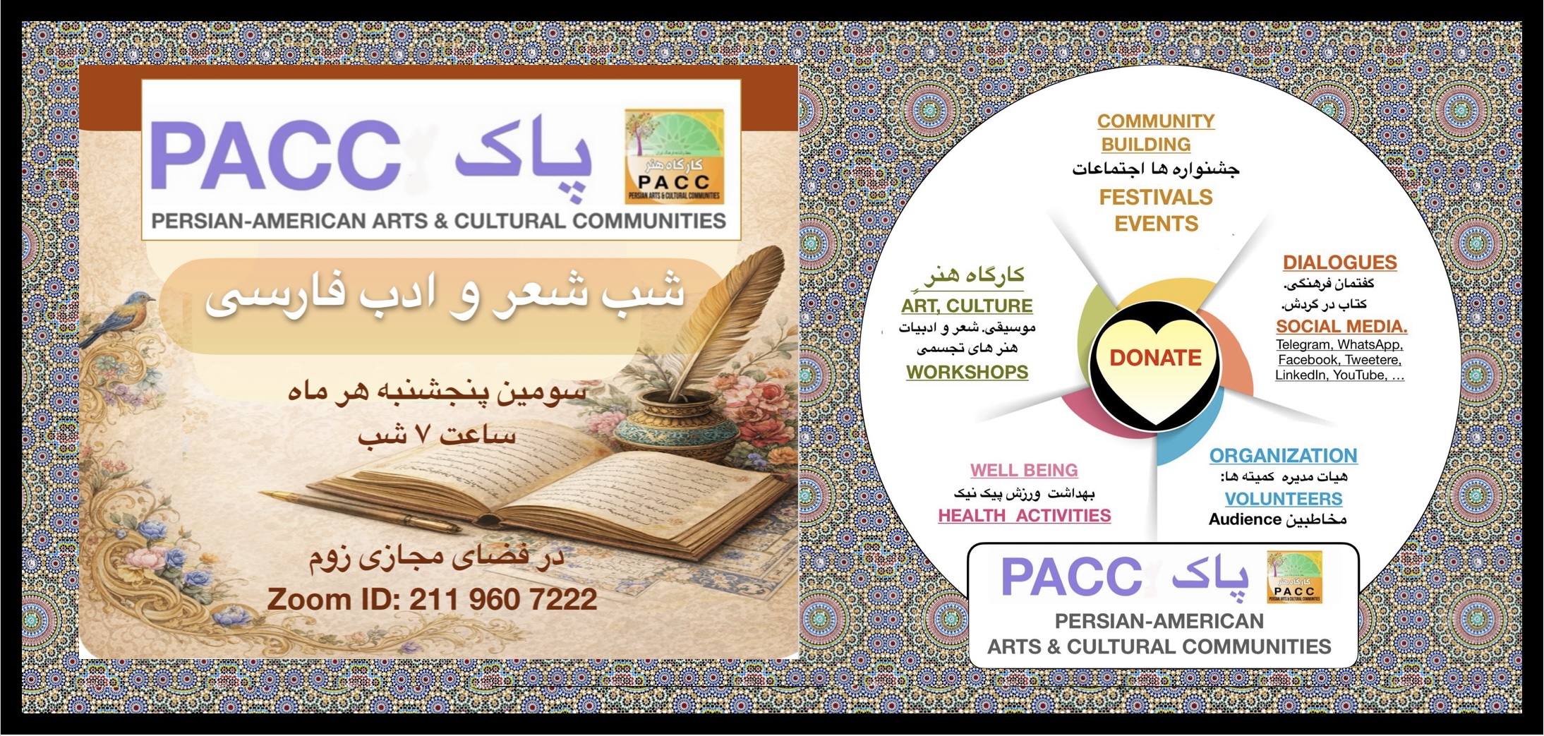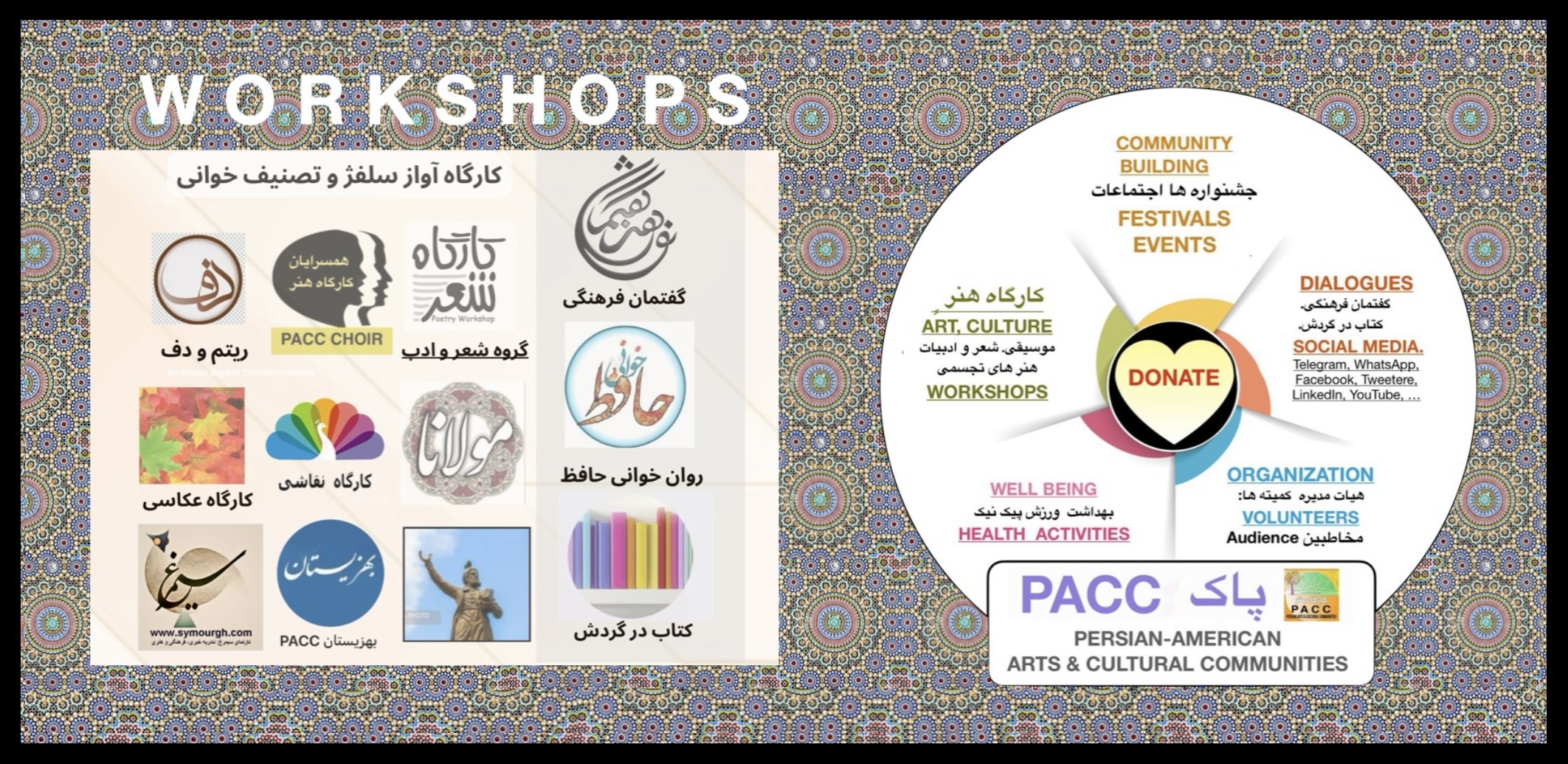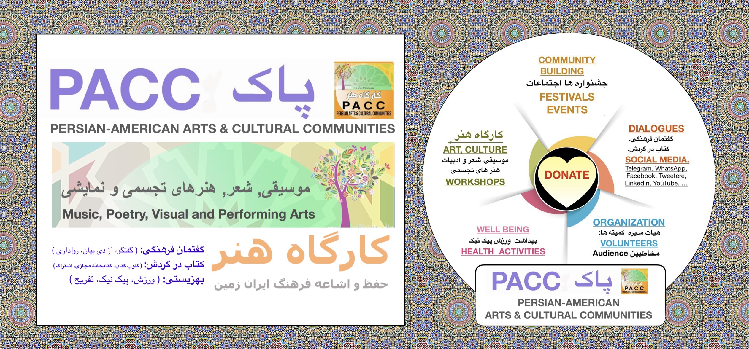 The Persian Arts & Cultural Communities (PACC) is a registered, non-profit organization with a 501 (c)(3) designation from the IRS. PACC’s Persian Arts & Cultural Communities (PACC) exists to strengthen and sustain the legacy of Persian Arts and Culture through community-building and education
