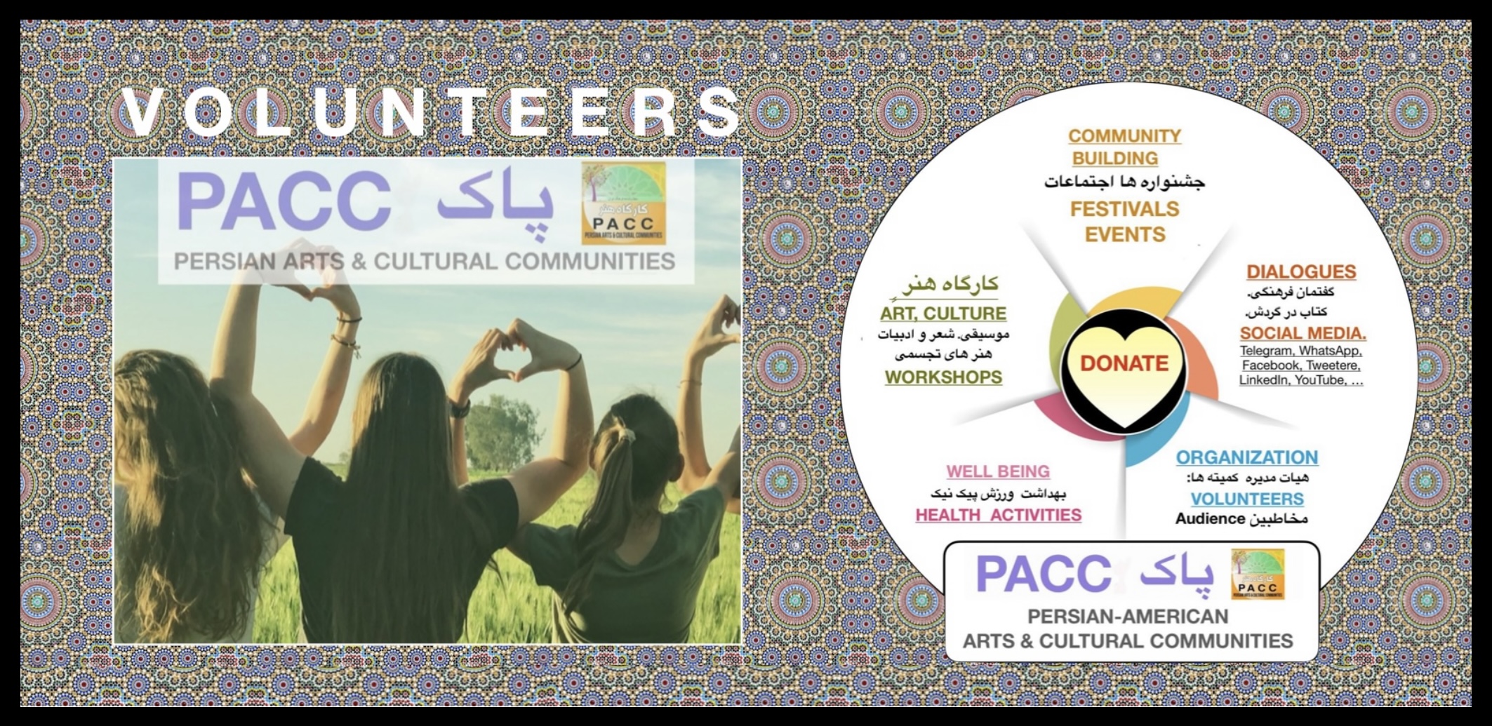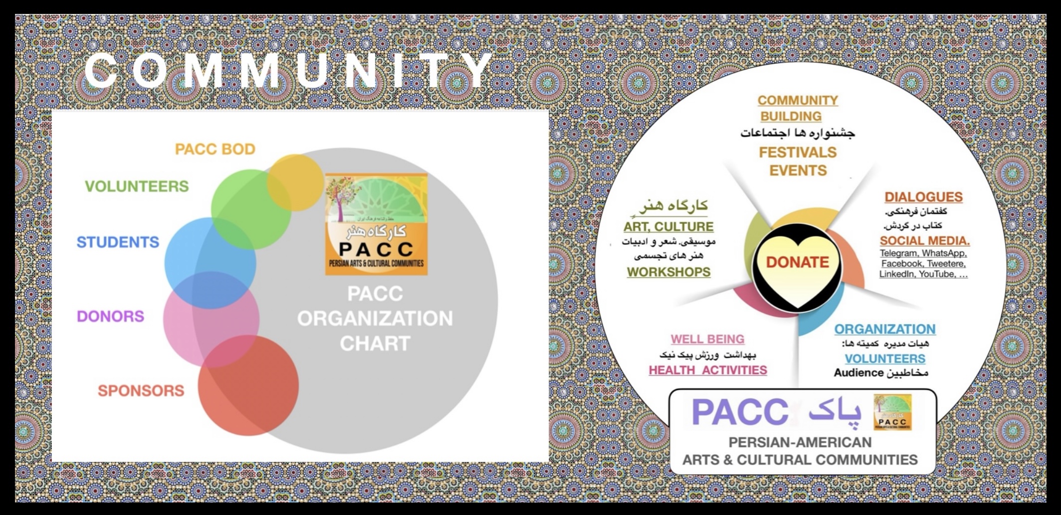 The Persian Arts & Cultural Communities (PACC) is a registered, non-profit organization with a 501 (c)(3) designation from the IRS. PACC’s Persian Arts & Cultural Communities (PACC) exists to strengthen and sustain the legacy of Persian Arts and Culture through community-building and education